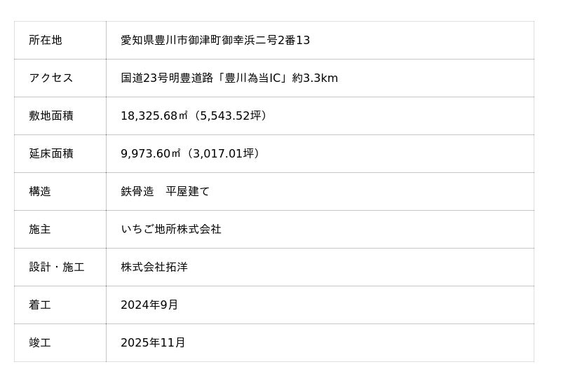 このたび、関東圏で物流および建設事業を営む株式会社拓洋(以下、「拓洋」という。)と連携して、関東圏以外で初となる愛知県にて「いちご豊川物流センター」の竣工を迎えることとなりました。