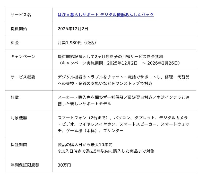 モバイル機器保証およびテクニカルサポートのグローバルリーダー、アシュリオン・ジャパン株式会社(本社:東京都港区、代表取締役社長:前田 隆志、以下「アシュリオン」)は、関西電力株式会社が提供する「はぴe暮らしサポート デジタル機器あんしんパック」に参画し、月額1,980円でトラブルサポート及び今お使いのスマホやパソコンなど家中のデジタル機器を一括保証し、修理・交換をエキスパートがワンストップで対応する画期的なサービスの提供を開始します。また、提供開始記念として2026年2月26日までにご契約されたお客様には契約後最初の2か月分の月額費用を無料にするキャンペーンを実施します。本サービス契約により、お客様ならびに同居家族が安心して、お持ちのデジタル機器を使い続けられる環境が整います。