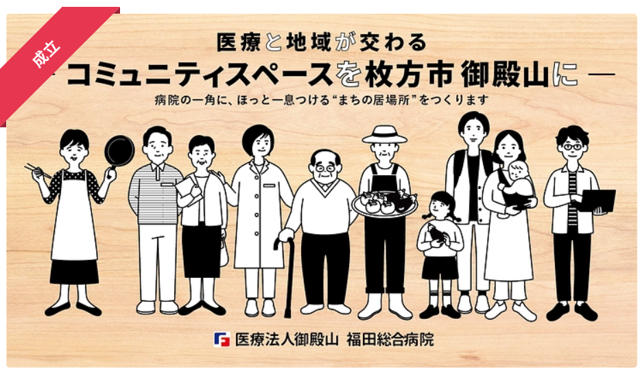 大阪府枚方市の医療法人御殿山 福田総合病院(所在地:大阪府枚方市、理事長:福田 正剛)は、開院50周年の節目に、2025年9月16日(月)~10月31日(木)の期間で実施したクラウドファンディングプロジェクト「医療と地域が交わるコミュニティスペースを枚方市御殿山に」において、目標金額100万円に対し、最終的に約220万円のご支援をいただき、2025年10月31日(木)にプロジェクトを無事終了いたしました。
