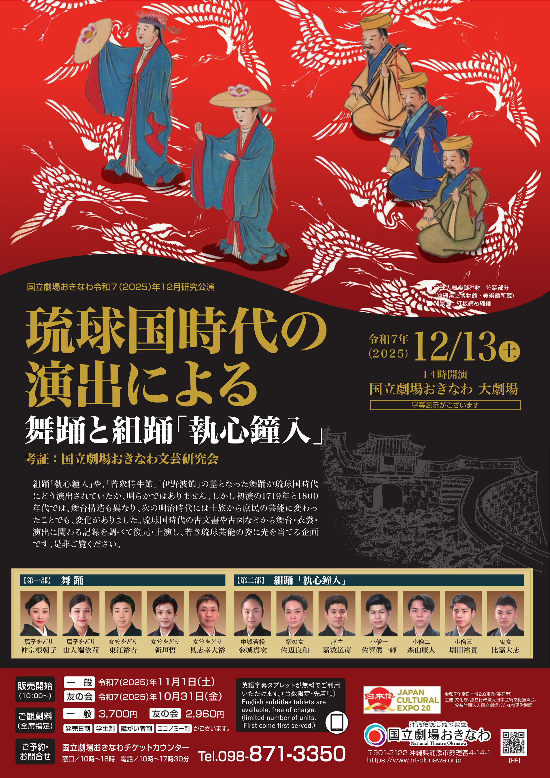 研究公演 琉球国時代の演出による舞踊と組踊「執心鐘入」組踊「執心鐘入」や、「若衆特牛節」「伊野波節」の基となった舞踊が琉球国時代にどう演出されていたか、明らかではありません。しかし初演の1719年と1800年代では、舞台構造も異なり、次の明治時代には士族から庶民の芸能に変わったことでも、変化がありました。琉球国時代の古文書や古図などから舞台・衣装・演出に関わる記録を調べて復元・上演し、若き琉球芸能の姿に光を当てる企画です。是非ご覧ください。