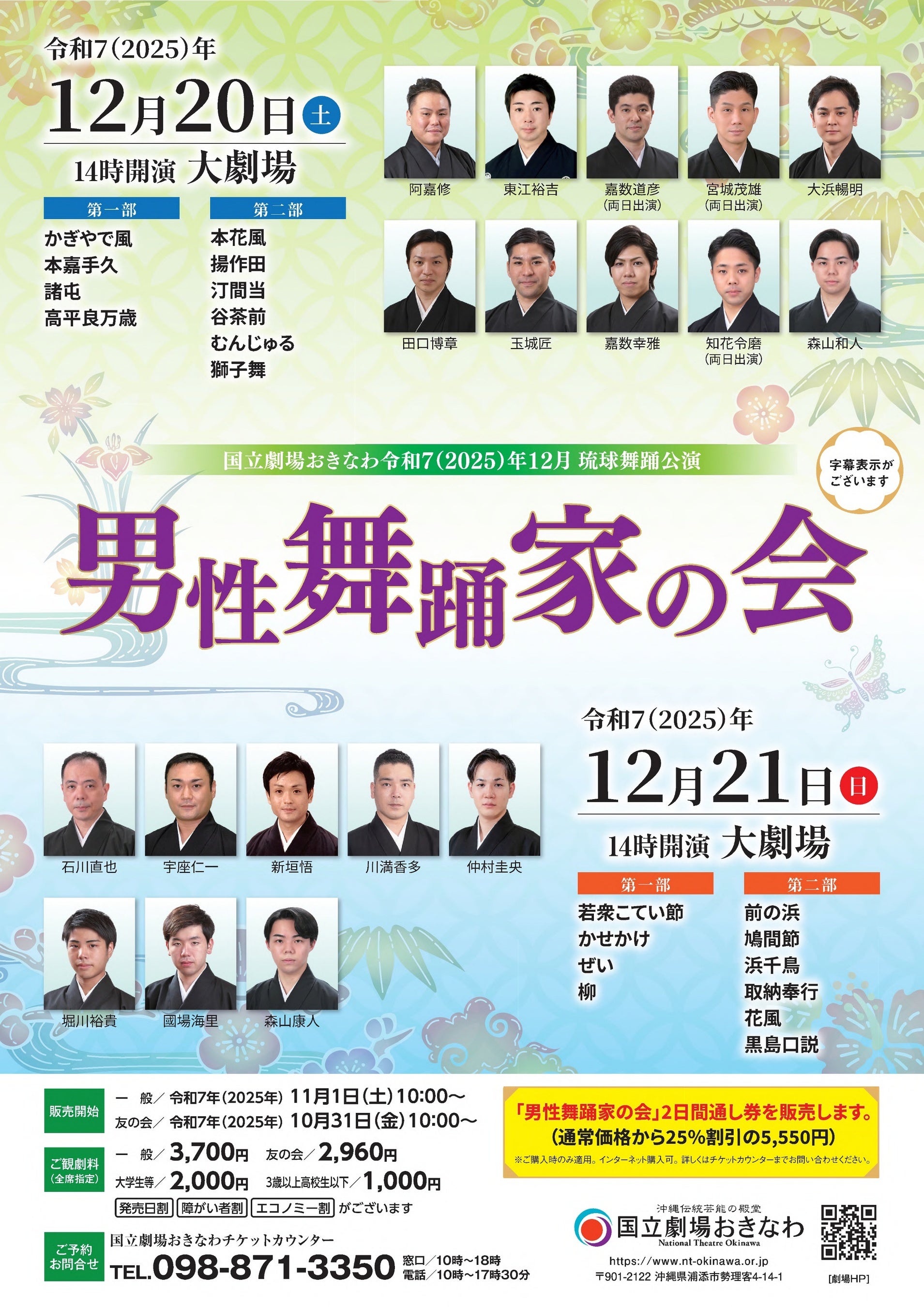 琉球舞踊公演 男性舞踊家の会毎年好評を得ている「男性舞踊家の会」。琉球舞踊や組踊をはじめ、様々な舞台公演においてその活躍が目覚ましい男性舞踊家達が一堂に集い、古典舞踊・雑踊を中心に多彩な舞踊をお届けします。男性舞踊家ならではの、魅力溢れる琉球舞踊の世界を二日間に渡ってお楽しみいただけます。ぜひ、ご期待ください。