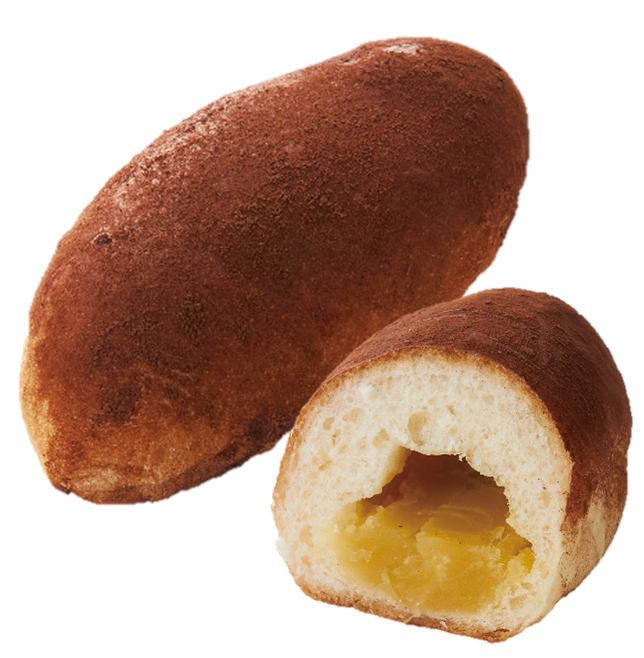 ふんわり生地にスイートポテト餡をたっぷり包み、ジュワッと溶けたバター入りマーガリンでしっとりコクのある味わいにしました。ほんのりとした苦みがあるココアパウダーを表面にまぶし、焼き芋の皮のような見た目で、まるで焼き芋を食べているようなパンです。