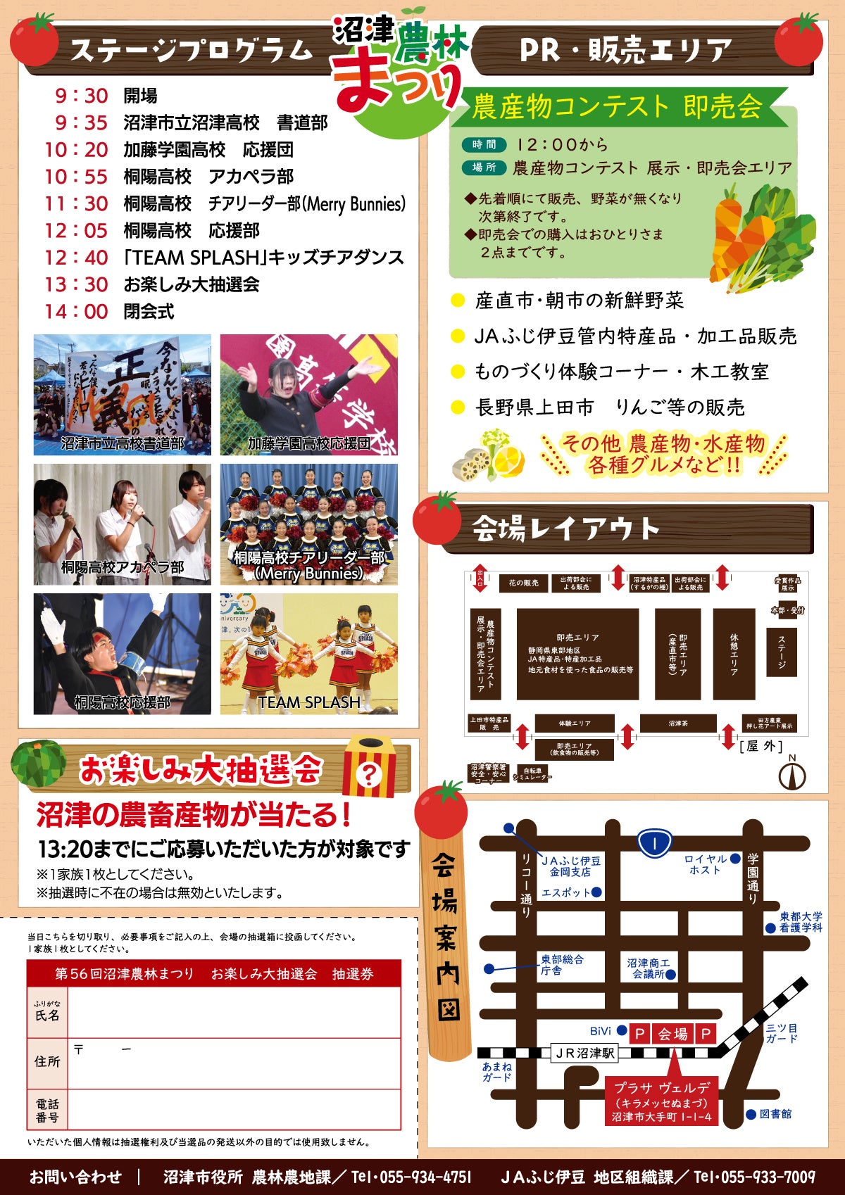 沼津農林まつりは、毎年12月に開催される、沼津市内の農畜産物の紹介、地産地消への理解と普及、農林業の振興等を目的にとした、静岡県東部地区有数の農林業イベントです。新鮮な野菜の産直市以外にも、さまざまな催し物や、東部地区を中心とした美味しいグルメの出店などがあり、大人から子どもまで楽しめるイベントなっております。