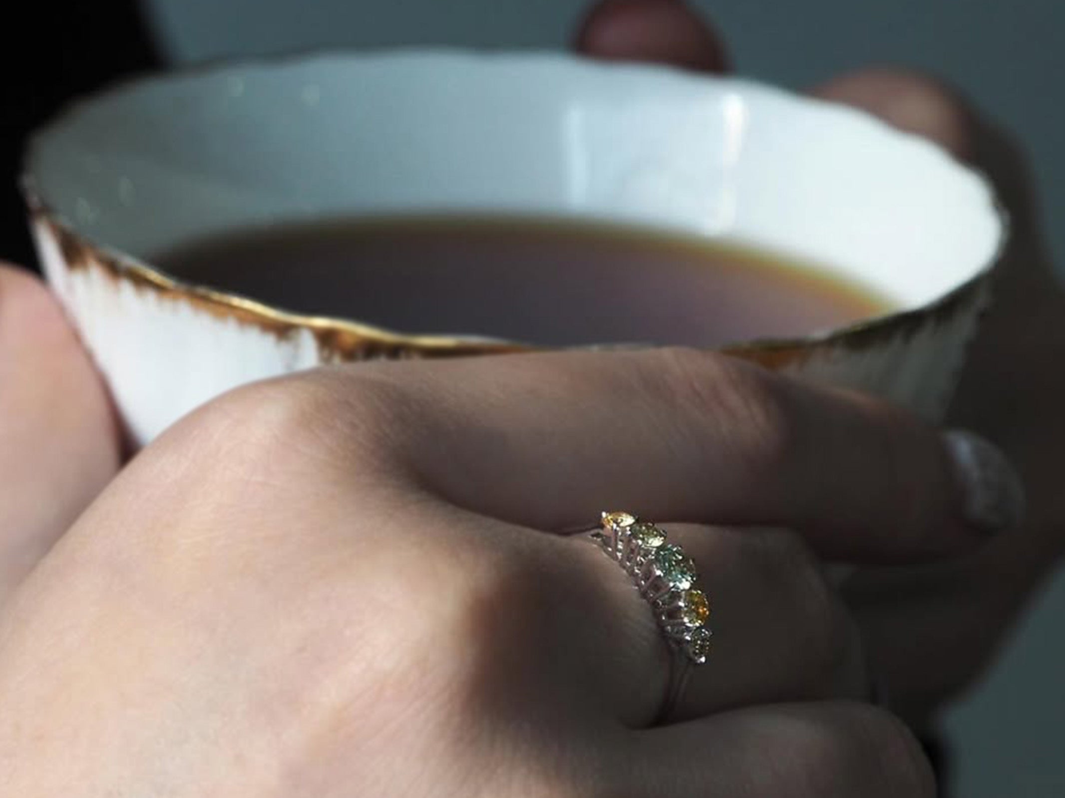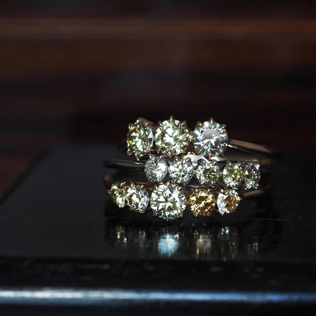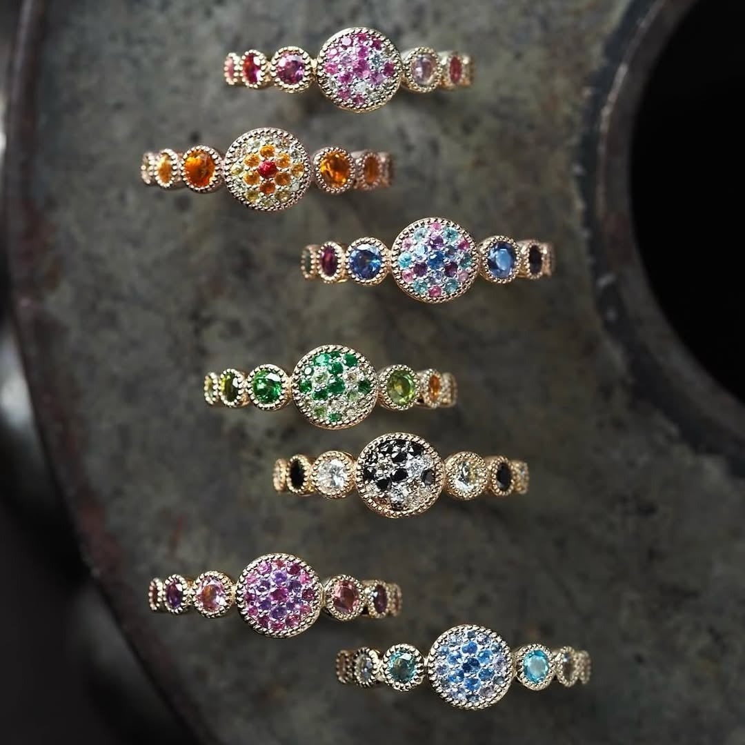上質なシャンパンカラーを基調に、創業デザイナーの成澤(@taisuke_parcelle)が石の表情を見ながら一点ずつ選定し、濃淡のニュアンスを整えた配色が特徴です。光を取り込む2段腰の石枠が存在感を保ちながらも軽やかさを生み、爪の向きや本数にも変化をつけることで、上下から挟む留めや三点留めなど、石の個性を引き出す仕立てとなっております。