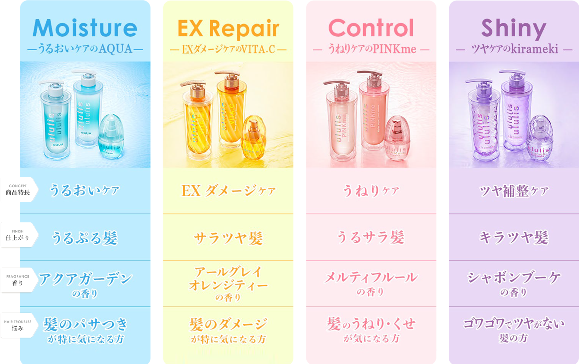 「うるおいケアのAQUA(アクア)」、「EXダメージケアのVITA.C(ビタシー)」、「うねりケアのPINKme(ピンクミー)」、「ツヤ補整ケアのkirameki(キラメキ)」の4シリーズ展開。