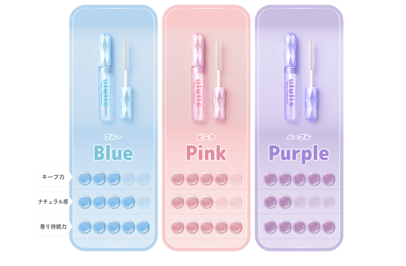 自然にキープする「ブルー」、うねりを抑制し、まっすぐキープする「ピンク」、長時間キープ※1するハードタイプの「パープル」の中から使用感や香り、お悩みに合わせて自分にあったシリーズをお選びいただけます。