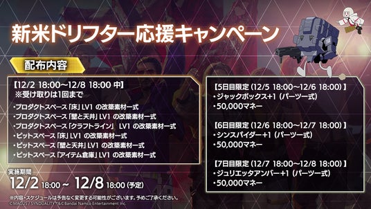 株式会社バンダイナムコエンターテインメントは、PlayStation(R)5/Xbox Series X|S/STEAM(R)『SYNDUALITY Echo of Ada』に関して、本日12月2日(火)より、新規プレーヤーのスタートダッシュをサポートするログインキャンペーンである「新米ドリフター応援キャンペーン」を開始いたしました。