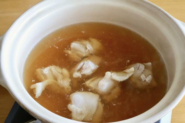 2. スープが沸騰してきたら弱火にし、ひと口サイズにカットした鶏もも肉を入れる。