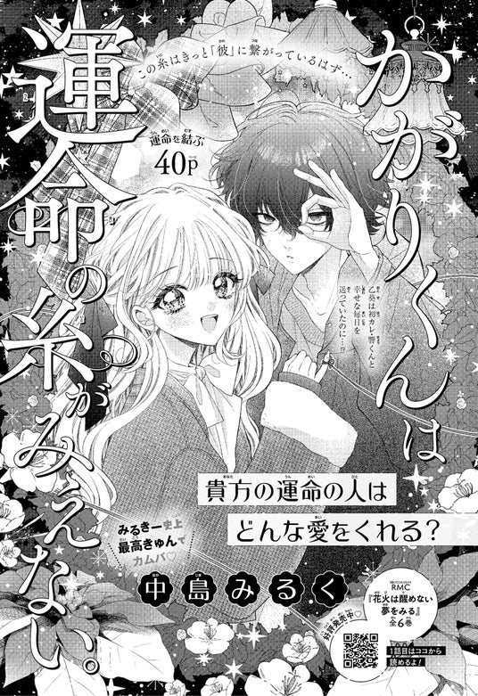 公爵令嬢の異世界転生・下剋上ストーリー『花火は醒めない夢をみる』(2022年)で話題を呼んだ中島みるく氏が、約1年半ぶりに「りぼん」本誌へカムバック。新作読みきり『かがりくんは運命の糸がみえない。』を40ページで掲載します。彼氏とラブラブな乙葵(おとぎ)は、クリスマス目前に、別のクラスのかがりくんから突然「別れたほうがいい」と告げられる。その言葉の真意とは――? “運命”を信じたくなる、ドラマチックなウィンター・ラブストーリー。