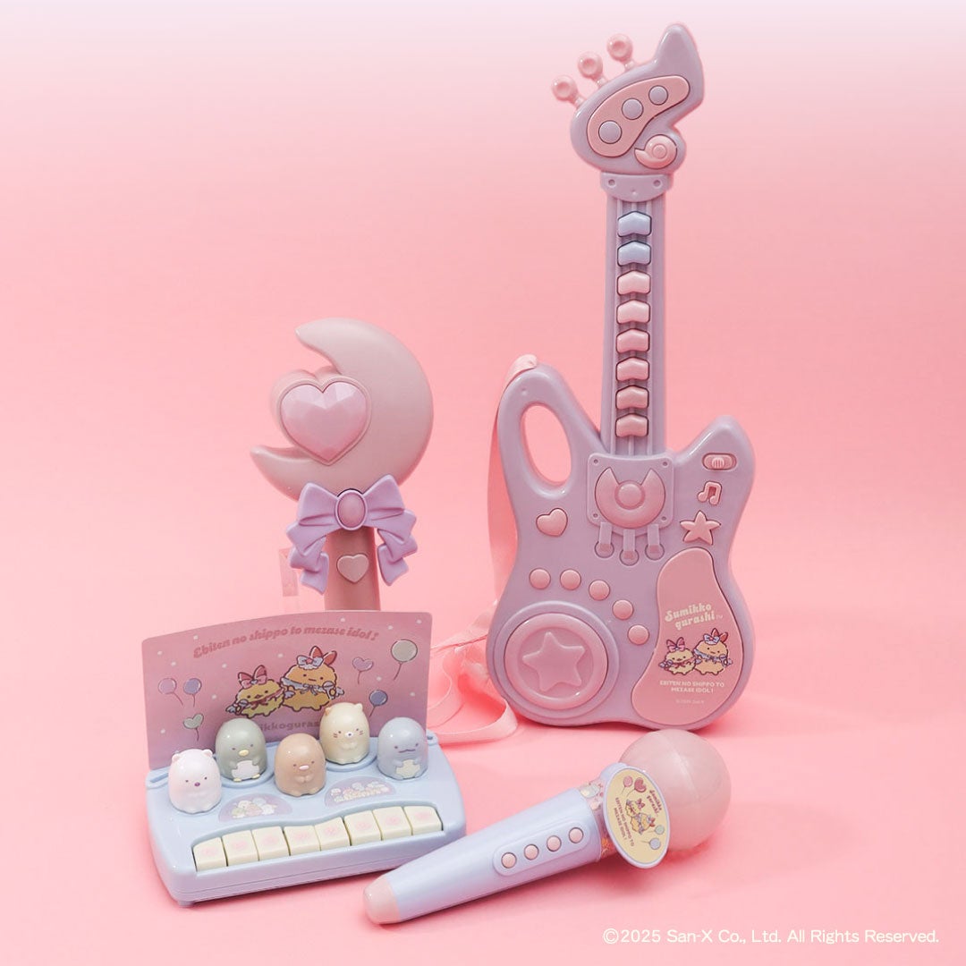 今回のコラボレーションではアイドルを目指す『えびてんのしっぽ』を主役に、アクセサリーや楽器のおもちゃなど、夢に向かってがんばる『えびてんのしっぽ』を応援できるグッズをご用意しました。お気に入りのアイテムを身につけて、みんなでいっしょに歌って踊ろう!