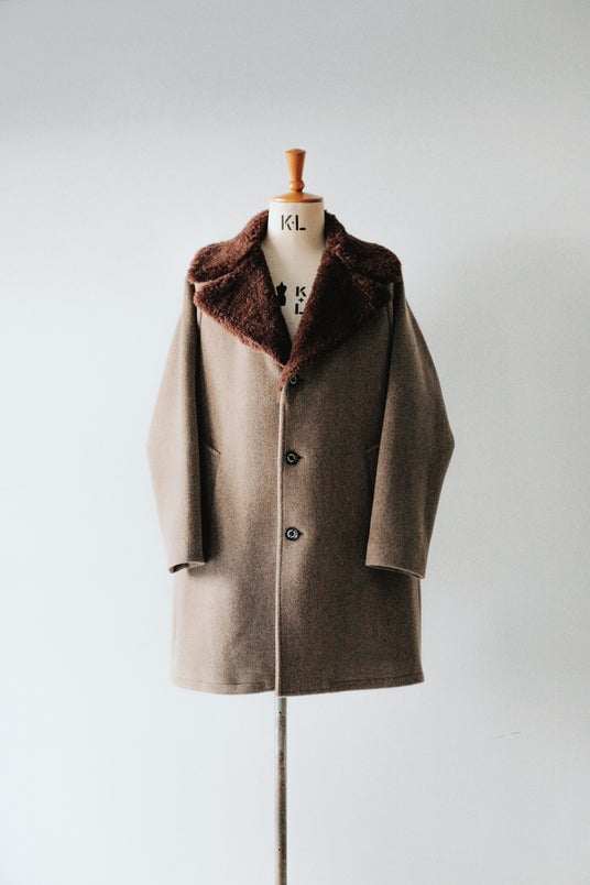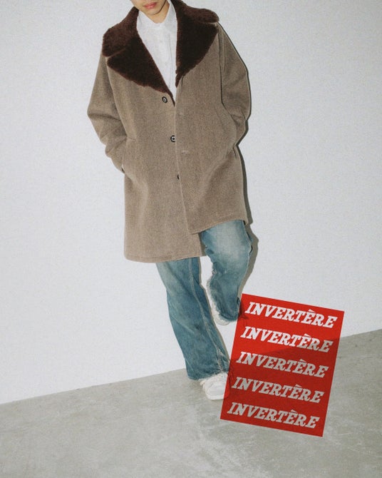 あるいはヨーロッパの石畳の上を歩くロックミュージシャン。現在の京都の多文化が入り混じる光景にも合いそう。表参道も近い環境にある。身につける人と周辺の環境、そのイメージが勝手に映像と音楽に繋がっていくような服は、つまりただ服としての機能や情報を超えて文脈と物語を含んでいる。この冬展開するインバーティアのカーコートは、一度袖を通せばなんとなくいろんなイメージが浮かんでくると思う。表地はインバーティア社がムーアブルックのトリプルパイルを復刻した生地で、厚みのあるウールに木目調のベージュ・カラー。このクラシックな手触りだけで心惹かれてやまないけれど、普通にコートにするとカントリーな方向に行きがちなところ、ボア付きのカーコートとして仕上げた。ラギッドでありながら貴族的で、某スケート・ブランドが展開していたカーコートのような、80-90年代の英国の文化と商業がアメリカ資本と混じり合った時期の空気を感じる。異なる