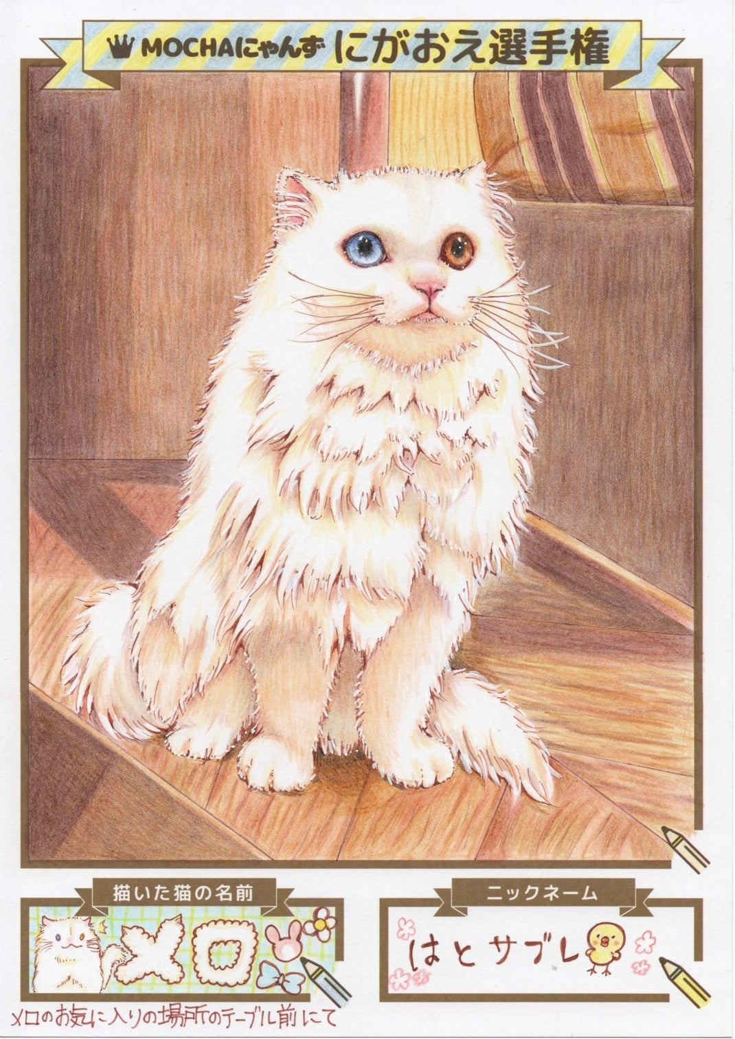 た瞬間に心がほっと温まるような、やわらかなタッチと色づかいが印象的でした。特に、オッドアイの美しい瞳や猫ちゃんのふわふわとした毛並みが丁寧に描かれており、繊細な観察力と表現力が感じられる一枚です。