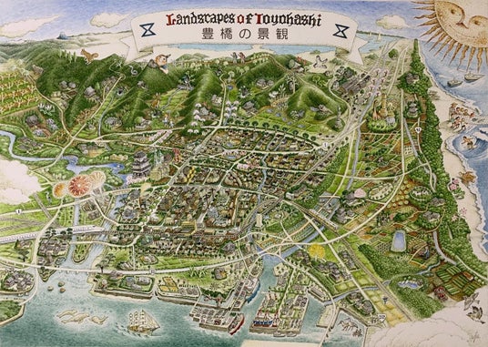 写真は豊橋市がつくっている、里山、川、海といった多様な自然に囲まれ、祭りなどを含むまちと自然が調和した様子が描かれている豊橋の景観マップという絵図です。