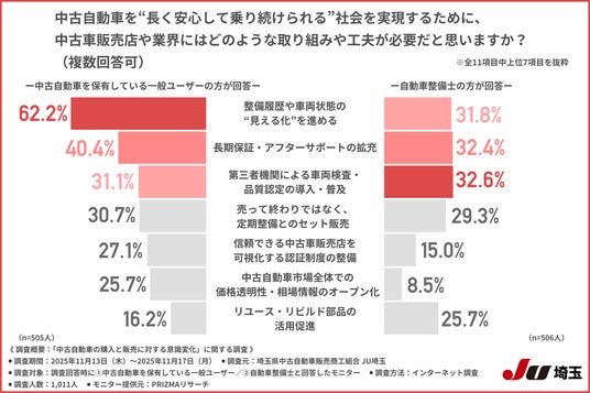 「中古自動車を“長く安心して乗り続けられる”社会を実現するために、中古車販売店や業界にはどのような取り組みや工夫が必要だと思うか」について尋ねたところ、中古自動車を保有している一般ユーザーの回答は『整備履歴や車両状態の“見える化”を進める(透明性の強化)(62.2%)』『長期保証・アフターサポートの拡充(40.4%)』『第三者機関による車両検査・品質認定の導入・普及(31.1%)』が上位になりました。