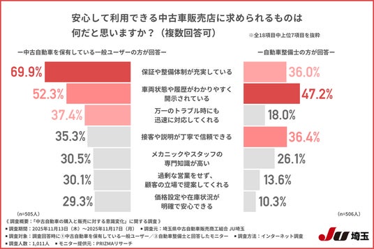 一般ユーザーは「保証や整備体制」「透明な情報開示」「トラブル時の対応」を求め、自動車整備士は「透明な情報開示」「丁寧な説明」「保証や整備体制」を重視しており、双方に共通するキーワードは“透明性”と“信頼性”です。