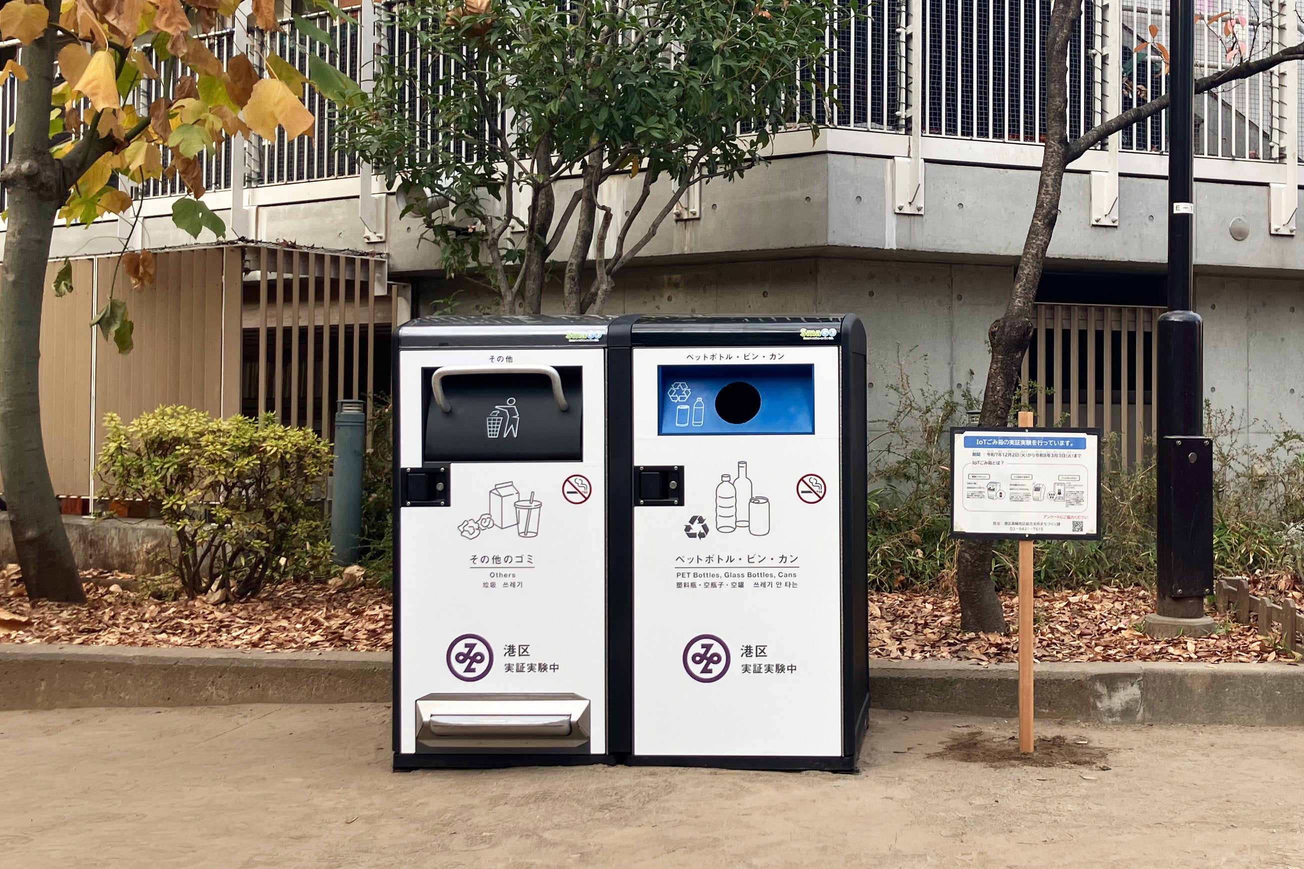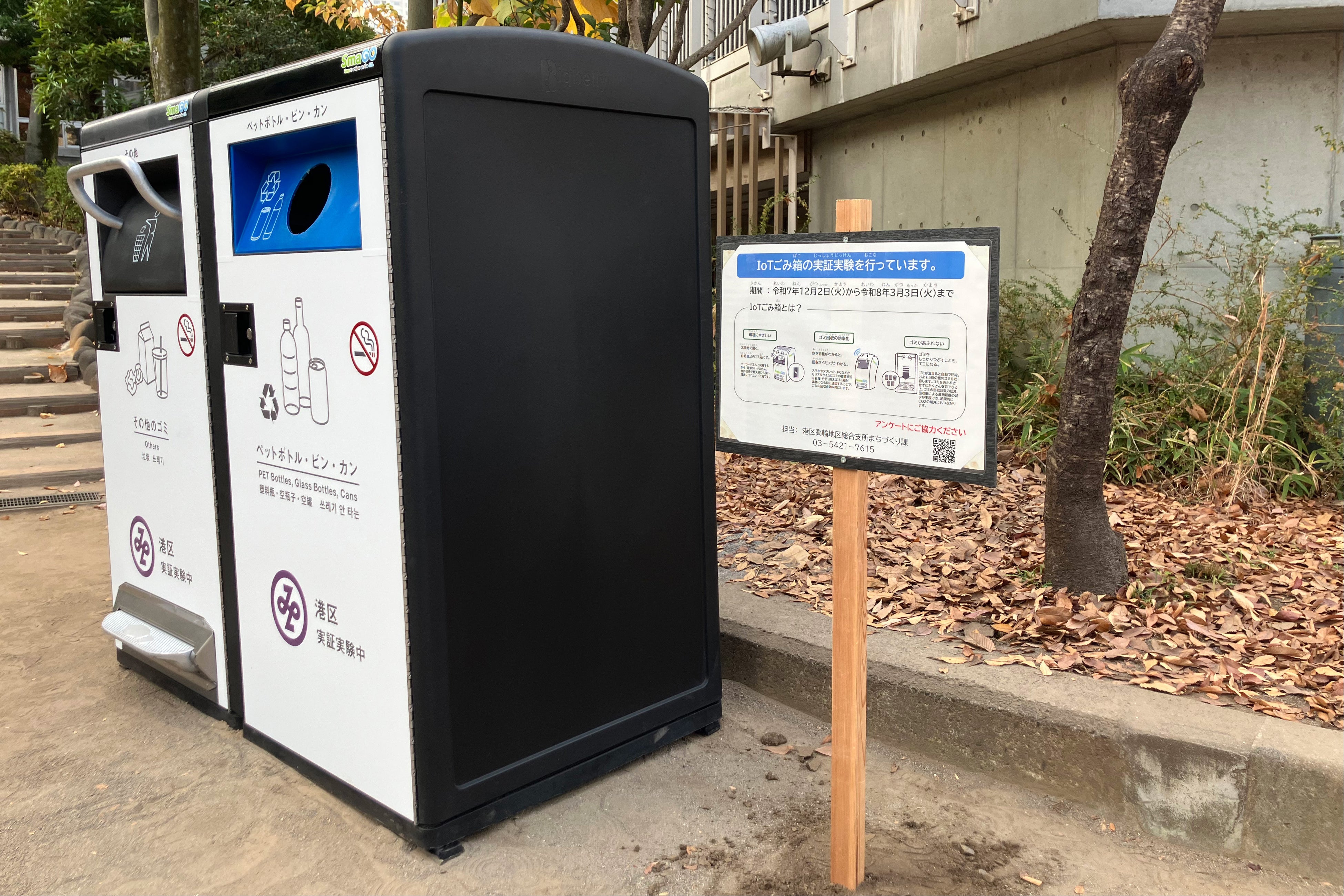 港区内での実証実験は本年11月に開始した高橋是清翁記念公園に続き2例目となり、本実証は2026年3月3日(火)までの3ヶ月間実施します。既存のゴミ箱をSmaGOに置き換えることで、ゴミ回収業務の効率化、公園の美観維持、分別促進を目指します。