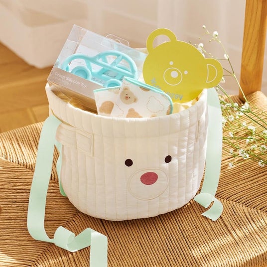 D by DADWAYで人気のリトルベアがモチーフ。お世話グッズを入れられる便利なバスケットに、おもちゃやミニタオル、Mサイズの紙おむつ7枚が入ったギフトセット。