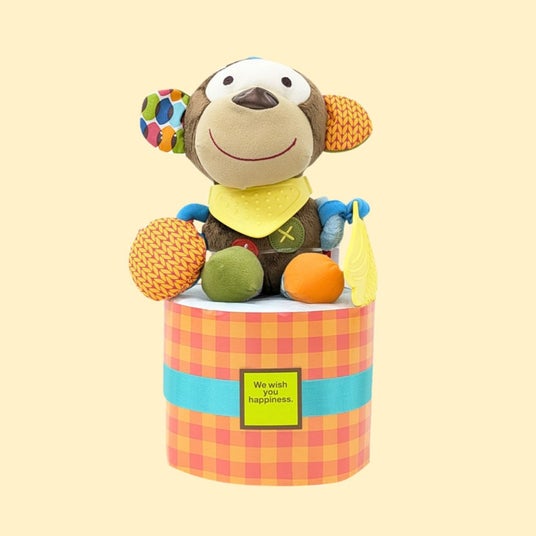 SKIP HOPの「ロールアラウンドラトル」が主役。体の部分はやわらかいゴム素材で、お子さまの小さな手でも持ちやすい。振るとカラカラ音が楽しめるビーズ付きです。Sサイズの紙おむつ5枚セット。