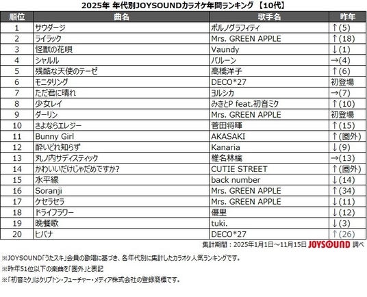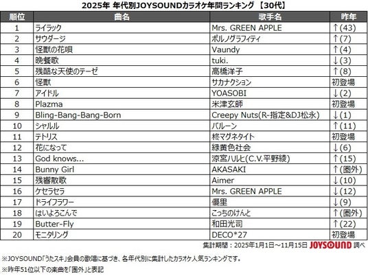 ▽特設ページ:2025年 年代別カラオケ年間ランキング