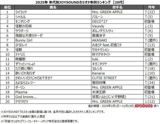 JOYSOUNDのカラオケで最も歌われた楽曲として、Mrs. GREEN APPLEの「ライラック」が栄冠を手にした2025年。この年間ランキングを10代から60代までの年代別に分析すると、世代を超えて愛される“カラオケの定番曲”や、世代ごとの特徴的な選曲傾向が浮かび上がりました。特設ページでは、男女別のランキングもあわせて公開中!上司や部下など、さまざまな年代の人とカラオケに行く機会が増える忘新年会シーズンの選曲のヒントとして、ぜひチェックしてみてください。