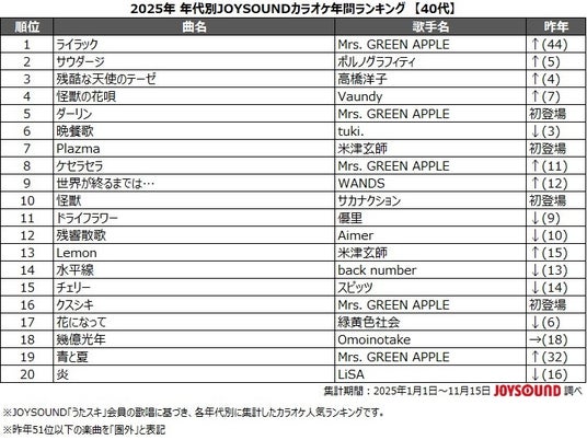 アニメソングに加え、近年のヒット曲やカラオケ定番曲の人気が高い40代。30代と同様、男女ともに首位を独占したMrs. GREEN APPLEは、「ライラック」「ダーリン」「ケセラセラ」「クスシキ」「青と夏」の5曲がTOP20に入るなど、厚い支持を獲得!ポルノグラフィティの「サウダージ」、WANDSの「世界が終るまでは…」、米津玄師の「Lemon」など、カラオケ定番曲も根強い人気を示しています。