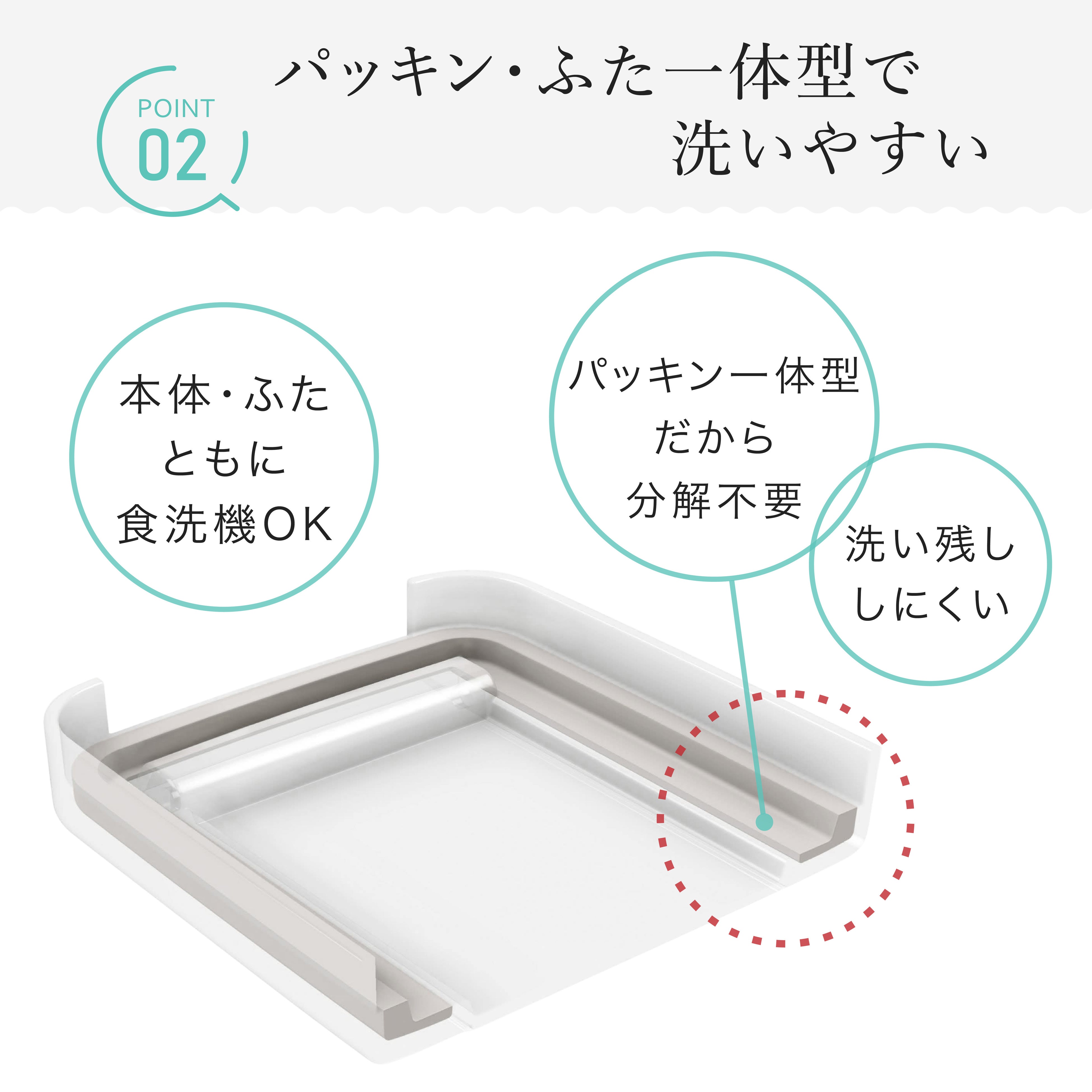 このお弁当箱は、ふたとパッキンが一体式で洗いやすい「イージーケアシリーズ」です。「毎日の洗い物が大変!」という小さなストレスを、少しでも軽減できる製品です。