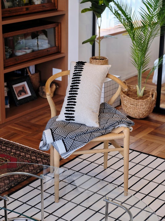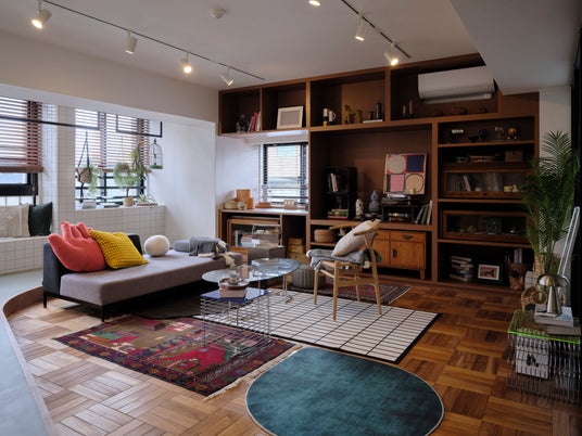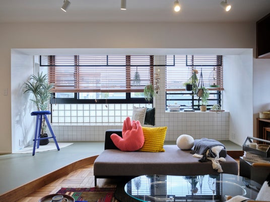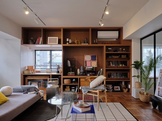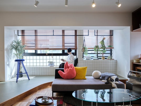 - 好きを集めて、囲まれて。古今東西の質感がミックスされたリビングリビングは、部屋の中心地であり、部屋の印象を大きく左右します。壁一面に広がる飾り棚には、もともとの窓を活かしつつ、ヨーロッパのアンティーク什器を埋め込みました。また、多治見のデッドストックタイルを使った窓台を設けるなど、一つの空間に多層的な表情を持たせています。