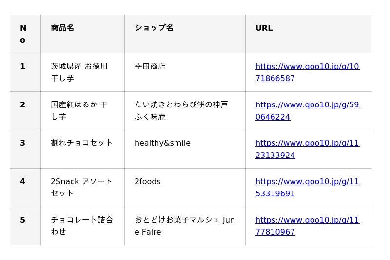 インターネット総合ショッピングモール「Qoo10」を運営するeBay Japan合同会社(本社:東京都港区、代表取締役:グ ジャヒョン)は、「スイーツ・お菓子」の販売数TOP5*を発表いたします。