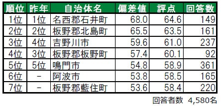 今年は板野郡上板町が、1位に輝きました。2位は、昨年4位から順位を上げた三好郡東みよし町です。3位は、2年連続で板野郡藍住町です。トップ7の内、6つが郡部に属する「町」、また、その内4つが板野郡の町という結果になっています。