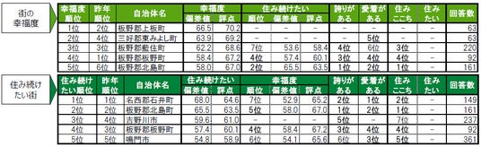 街の幸福度は、1位板野郡上板町、2位三好郡東みよし町。3位は2年連続で板野郡藍住町。
