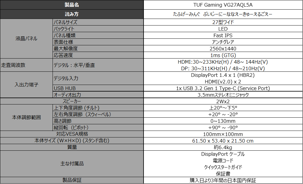 製品詳細:https://www.asus.com/jp/displays-desktops/monitors/tuf-gaming/tuf-gaming-vg27aql5a/