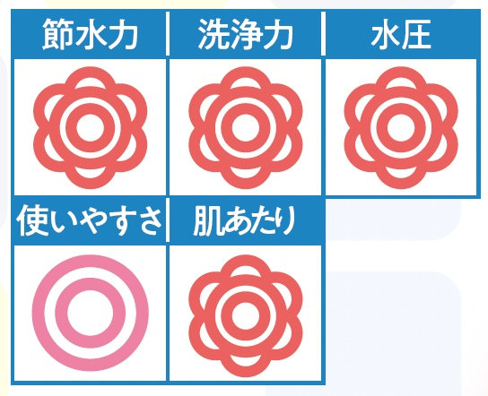 節水力、洗浄力、水圧、使いやすさ、肌あたりの5項目をテスト