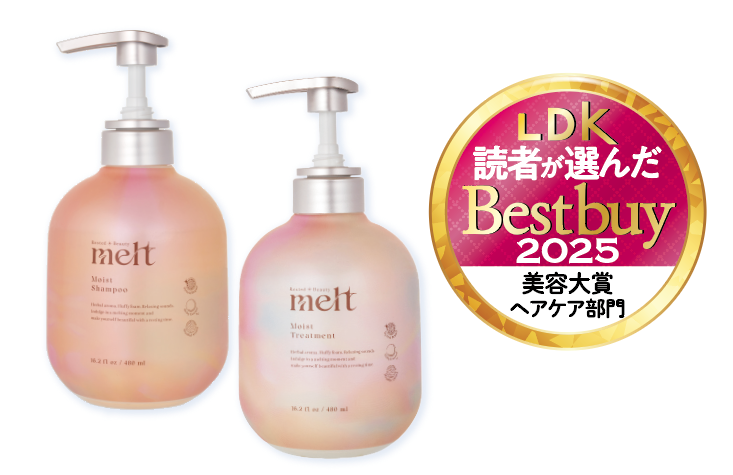 メルトは、乾燥、摩擦、湿気などさまざまなダメージに対応。洗っただけで「髪質が変わった?」と思うほどやわらかくなり、ツヤとまとまりに優れた若々しい印象に!