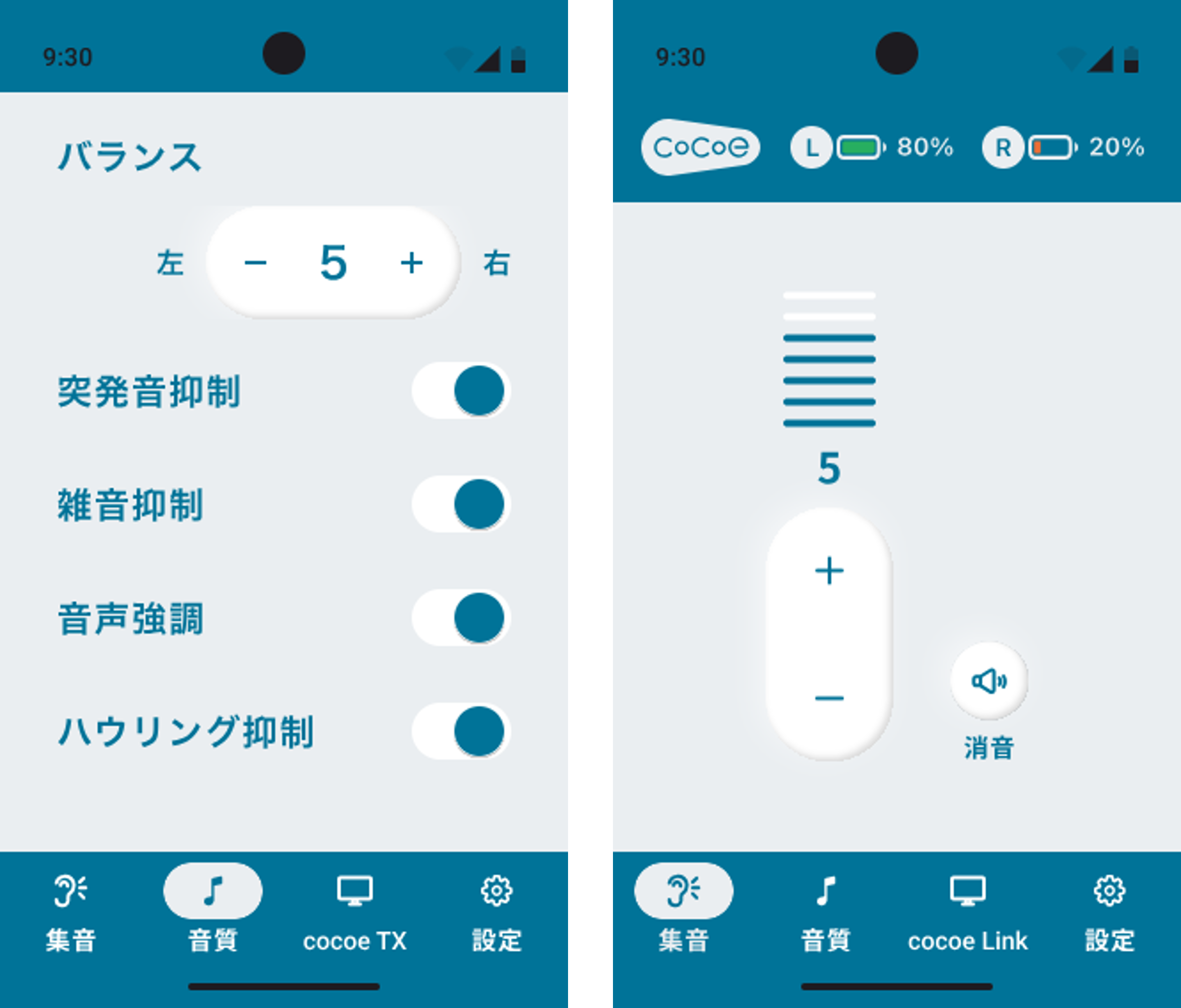 「cocoe Ear」単体での操作も可能ですが、スマートフォンを利用する方に向け、専用アプリ 「cocoe Connect」 を新規開発。スマートフォンの操作が苦手な方でも迷わず使えるよう設計された、シンプルで直感的なUIが特長です。アプリ上では「集音モード」と「TVモード」の切り替えがスムーズに行えるほか、音量や音質などの調整も簡単に操作できます。また、大きなボタンと視認性の高い画面デザインにより、誰でも安心して使えるデザインを採用。自分に合った“聞こえ”をスマートフォン一つで自在にコントロールできるアプリです。