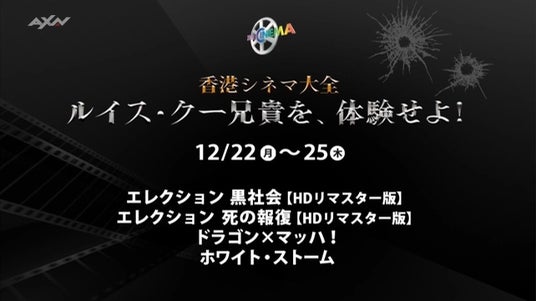 日本唯一の洋画専門チャンネル ザ・シネマ(AXN株式会社、本社:東京都渋谷区、代表取締役社長 大園天樹)では、香港映画の魅力を余すところなく特集する【香港シネマ大全】の12月は、『トワイライト・ウォリアーズ 決戦! 九龍城砦』で大ブレイクした、香港アクション界を牽引する孤高のカリスマ俳優ルイス・クーを特集!黒社会の中で頭角を現す次世代リーダーをルイス・クーが演じた『エレクション』シリーズ2部作CSベーシック初放送や、傑作アクション『ドラゴン×マッハ!』などを含む全4作品を12月22日(月)~25日(木)に放送いたします。