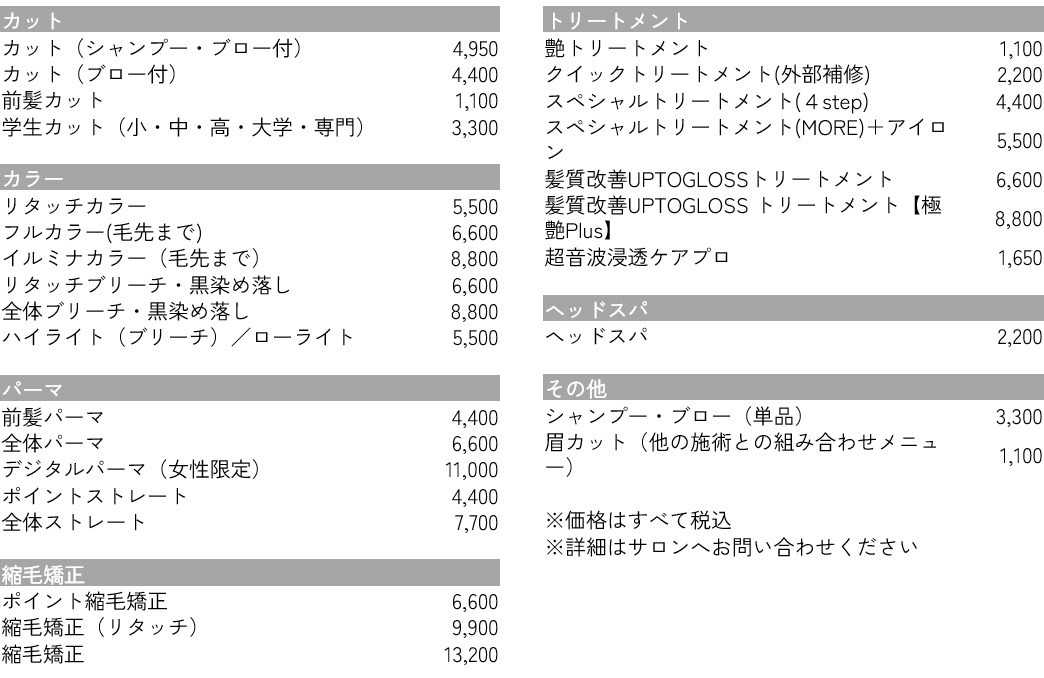 ※ロングの場合、ご相談の上プラス料金をいただく場合がございます。