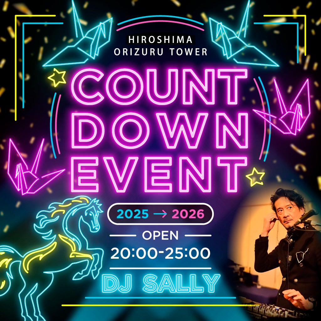 おりづるタワー(おりづるタワー株式会社、所在地:広島市中区大手町1-2-1、代表取締役社長兼COO :大上進)は大晦日に、気軽に参加できるカウントダウンイベントを開催します。本イベントでは、80~90年代の名曲に包まれ、DJ. SALLYが奏でる往年のヒットソングとダンスナンバーで新年を迎える、音楽と一体感に満ちた年越し体験を提供いたします。
