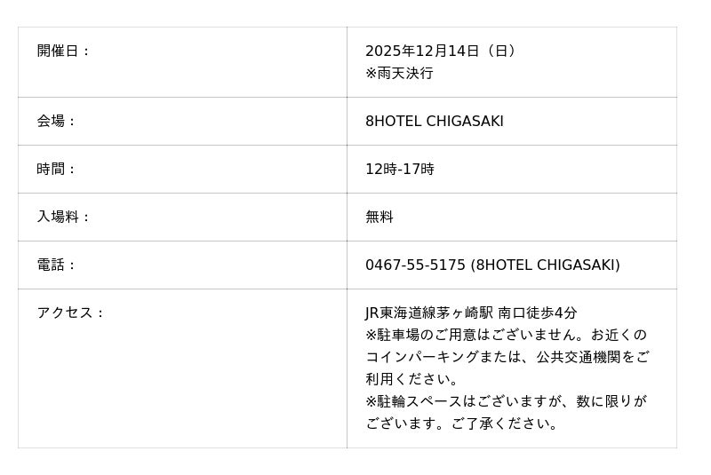 株式会社DD グループの連結子会社である湘南レーベル株式会社(本社:神奈川県藤沢市/代表取締役社長:楠目 圭佑)が運営する8HOTEL CHIGASAKI(エイトホテル茅ヶ崎)では、2025年12月14日(日) 12:00-17:00「8HOTEL CHIGASAKI CHRISTMAS MARCHE vol.4」を開催いたします。 4度目の開催となる今回は、フリーマーケットをメインに開催いたします。その他、マルシェ出店や、8HOTEL CHIGASAKIオリジナルのホリデーシーズンにぴったりなワークショップ、フードなどコンテンツを豊富に展開いたします。