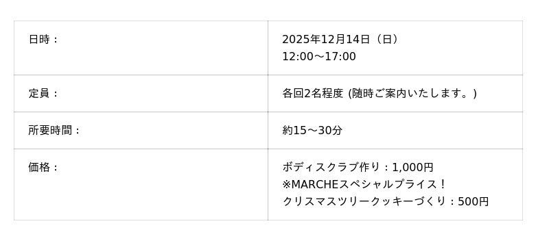 さらに、今回はワークショップも充実。大好評のオリジナルボディスクラブ作りに加え、今回は新企画として、見た目もかわいらしい“食べられるクリスマスツリー”作り体験も登場いたします。大人も子どもも楽しめて、心もお腹も満たされるマルシェイベントです。