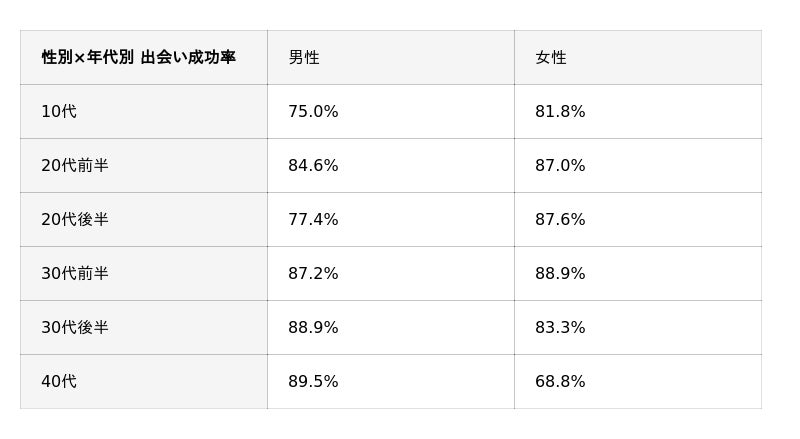 中でも30代の出会い成功率が特に高く、性別や年齢による大きな不利はないことが明らかになりました。