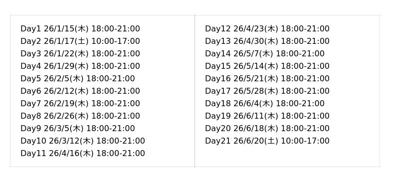・ 原則、全21日程全てにご参加いただくこと