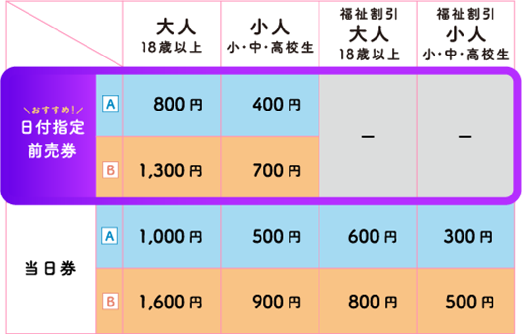 料金変動制のため、来場日により料金が異なります。詳しくは左表および公式サイトにてご確認ください。