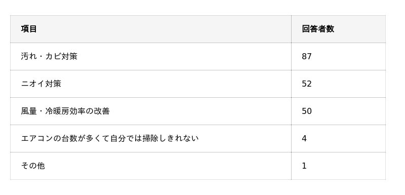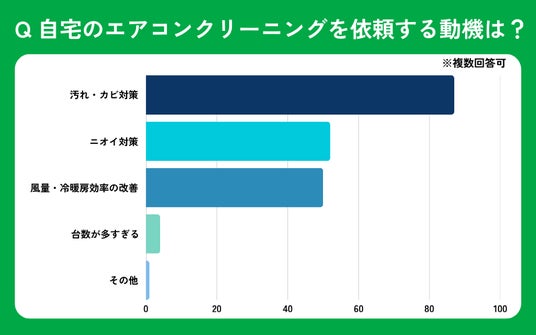 ・自宅のエアコンクリーニングを依頼する動機は「汚れ・カビ対策」が最も多いが、「ニオイ対策」「風量・冷暖房効率の改善」という目的も多数見受けられる。