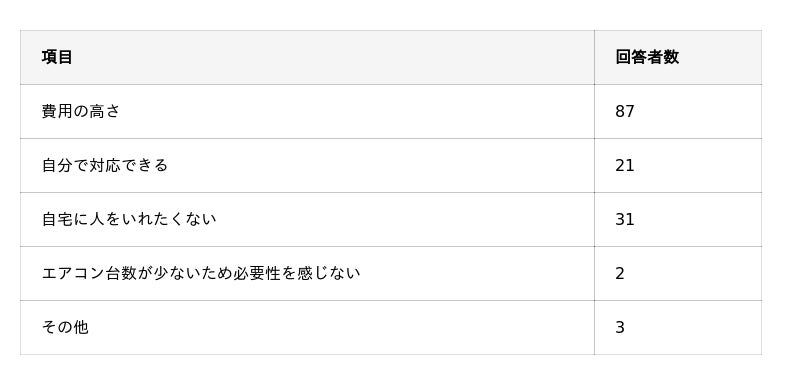 ・自宅のエアコンクリーニングをためらう理由には「費用の高さ」があるが「自宅に人をいれたくない」という心理的な影響もある。