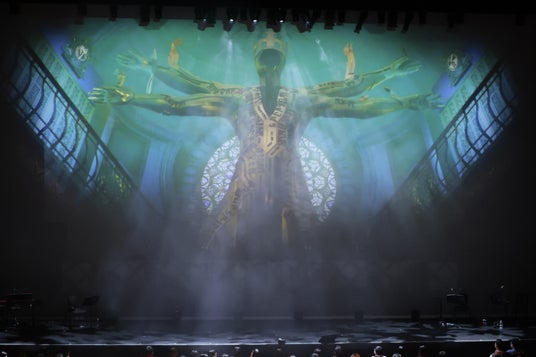 紗幕を使った映像演出も印象的。ガリカが飛び回る様子や、戦闘時の攻撃演出などが紗幕に映し出され、没入感をいっそう高める。とくに正体不明の怪物ニンゲンがステージ上に映し出される瞬間は圧巻で、その歪な恐ろしさを目の当たりにすることができる。