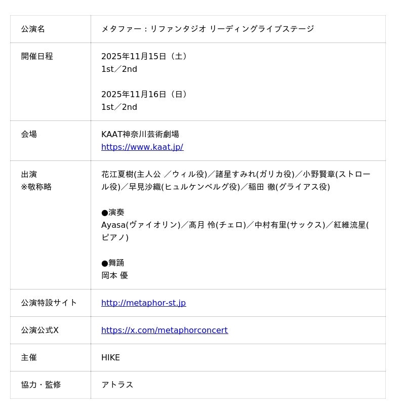 株式会社HIKE(本社:東京都新宿区、代表:三上政高)は、主催・制作する「メタファー:リファンタジオ リーディングライブステージ」を11月15日(土)・16日(日)にKAAT神奈川芸術劇場にて上演いたしました。本リリースでは、11月15日(土)2nd公演の模様をレポートします。