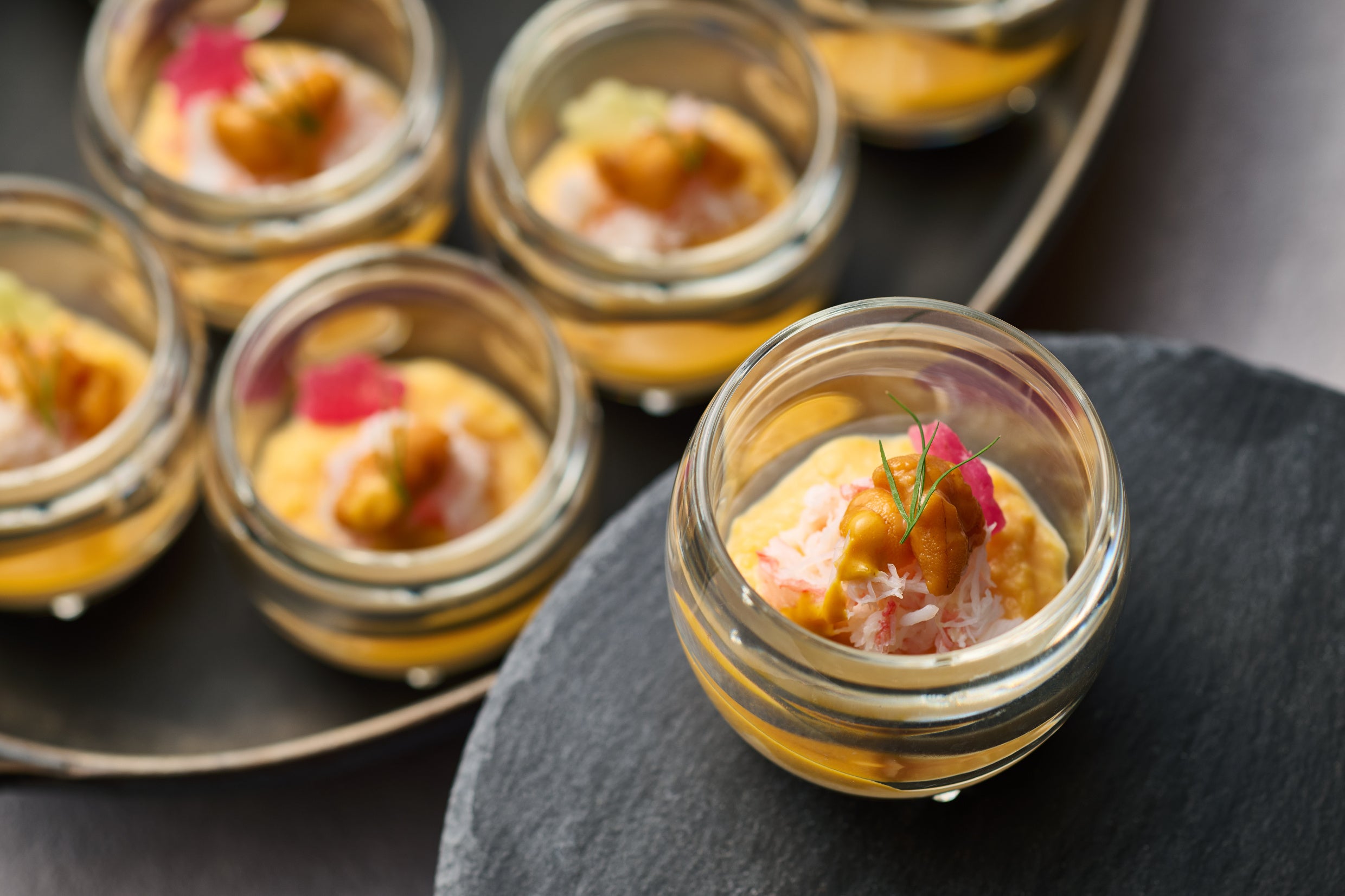 出汁を入れ、クリーミーに仕上げたウフブルイエ。甘み豊かな香住ガニとウニを贅沢に合わせ、芳醇なトリュフの香りを纏わせた一品。