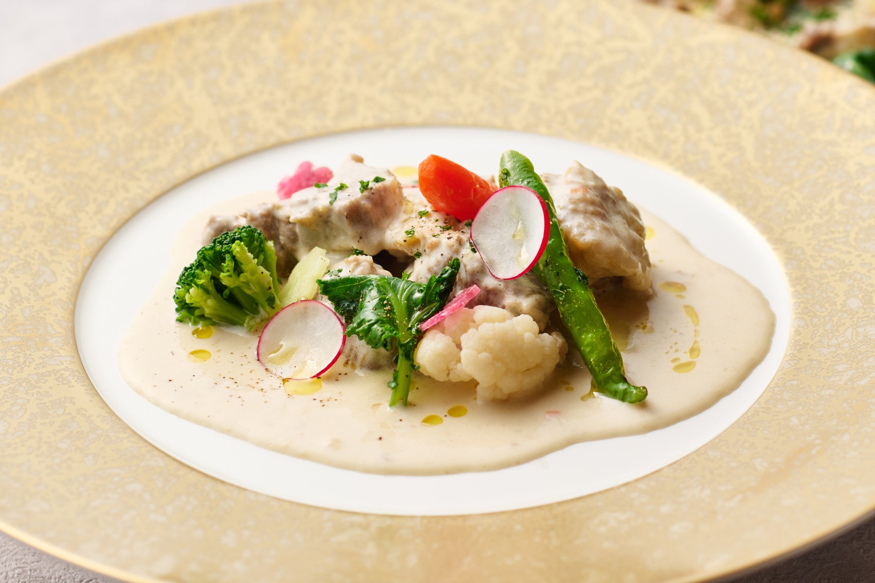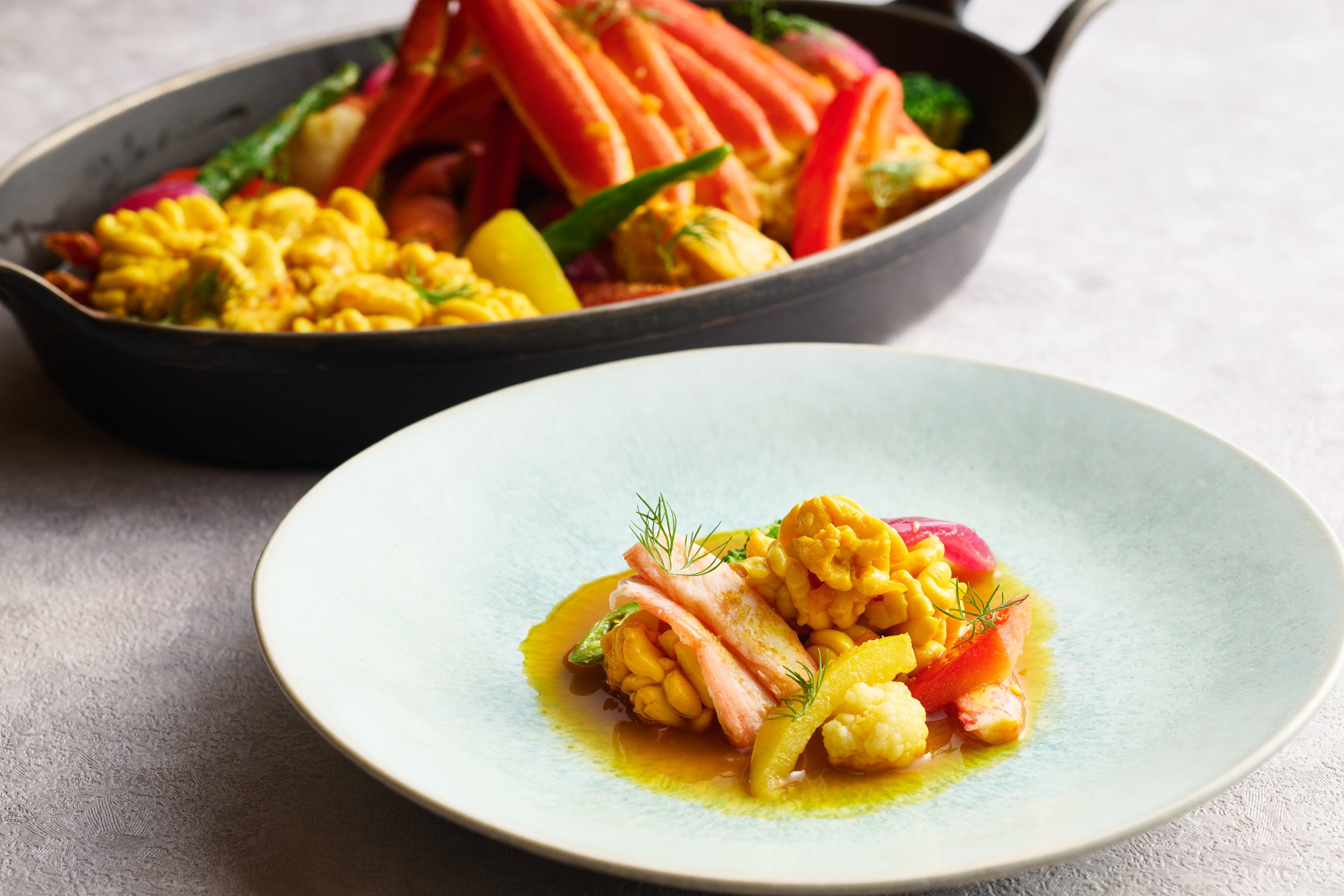 ブイヤベースの出汁を使い、香住ガニと雲子に優しく火入れすることで、香住ガニのうま味を最大限に引き出した、この季節ならではの一品。