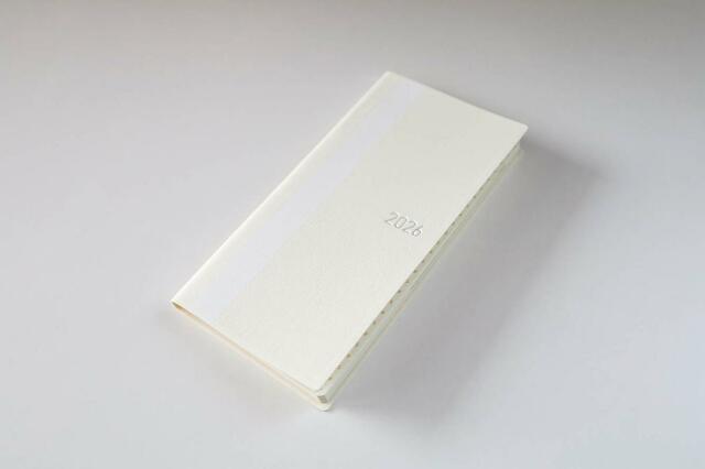 革のようなシボ感のあるアイボリーの表紙に、まっすぐ白いラインが入った潔いデザインです。