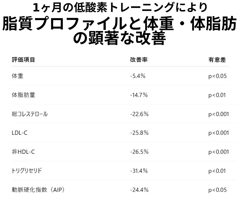 1ヶ月の低酸素トレーニングにより、脂質プロファイルと体重・体脂肪の顕著な改善